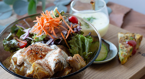 フードも本格的で、NYスタイルの「チキンオーバーライス」は、ヨーグルトソースの酸味が効いたリピート必至の看板メニュー。ランチ、カフェタイムともに、非日常の落ち着いた時間を過ごせる貴重な一軒です。