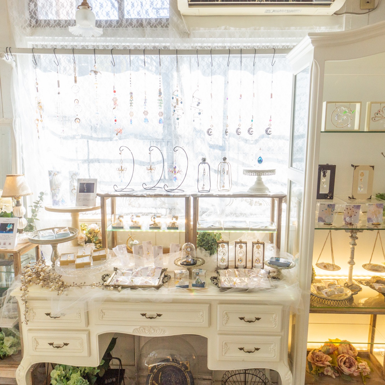 「透明」や「キラキラ」をテーマに、全国の作家さんから集められたアクセサリーや雑貨が並びます。店内はまるで宝石箱のような空間で、女性の心をくすぐる可愛らしいアイテムがいっぱい。