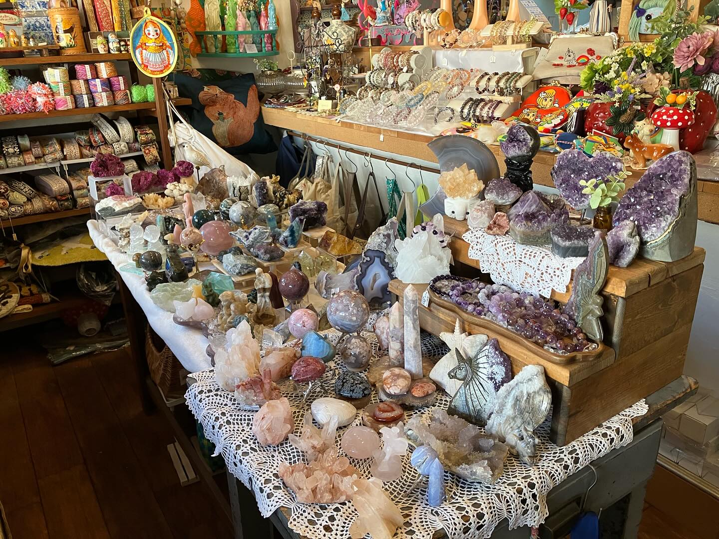 店内に入ると、そこはまるで「おもちゃ箱」をひっくり返したようなワクワクする空間。店主セレクトのレトロでポップな雑貨や、本格的な天然石(パワーストーン)、ハンドメイド作品が所狭しと並んでいます。