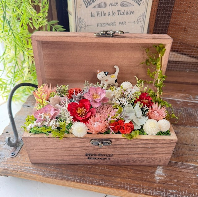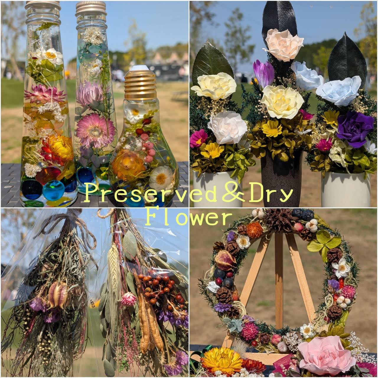 本物のお花を使っていろいろな雑貨に花を咲かせるように喜びを味わいながら楽しんで制作しています。作品を手にしてくれた方がほっと癒され、かわいい、綺麗と心がキュンとときめくようにと願いを込めて制作しています