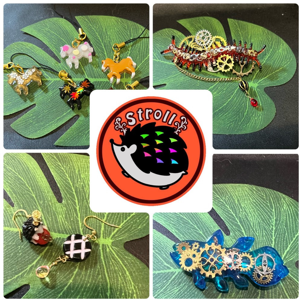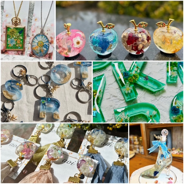 わんちゃんねこちゃんはもちろんのこと可愛い小動物からドキッとする奇蟲まで色んな生き物のモチーフのレジンアクセサリーをお作りしてます。珍しい本物のタツノオトシゴを使ったアクセサリーや縁起の良いペットの愛蛇の一味ちゃんの抜け殻を入れたアクセサリーもございます。カラフルでうるツヤなアクセサリーを是非お手に取ってご覧下さい。