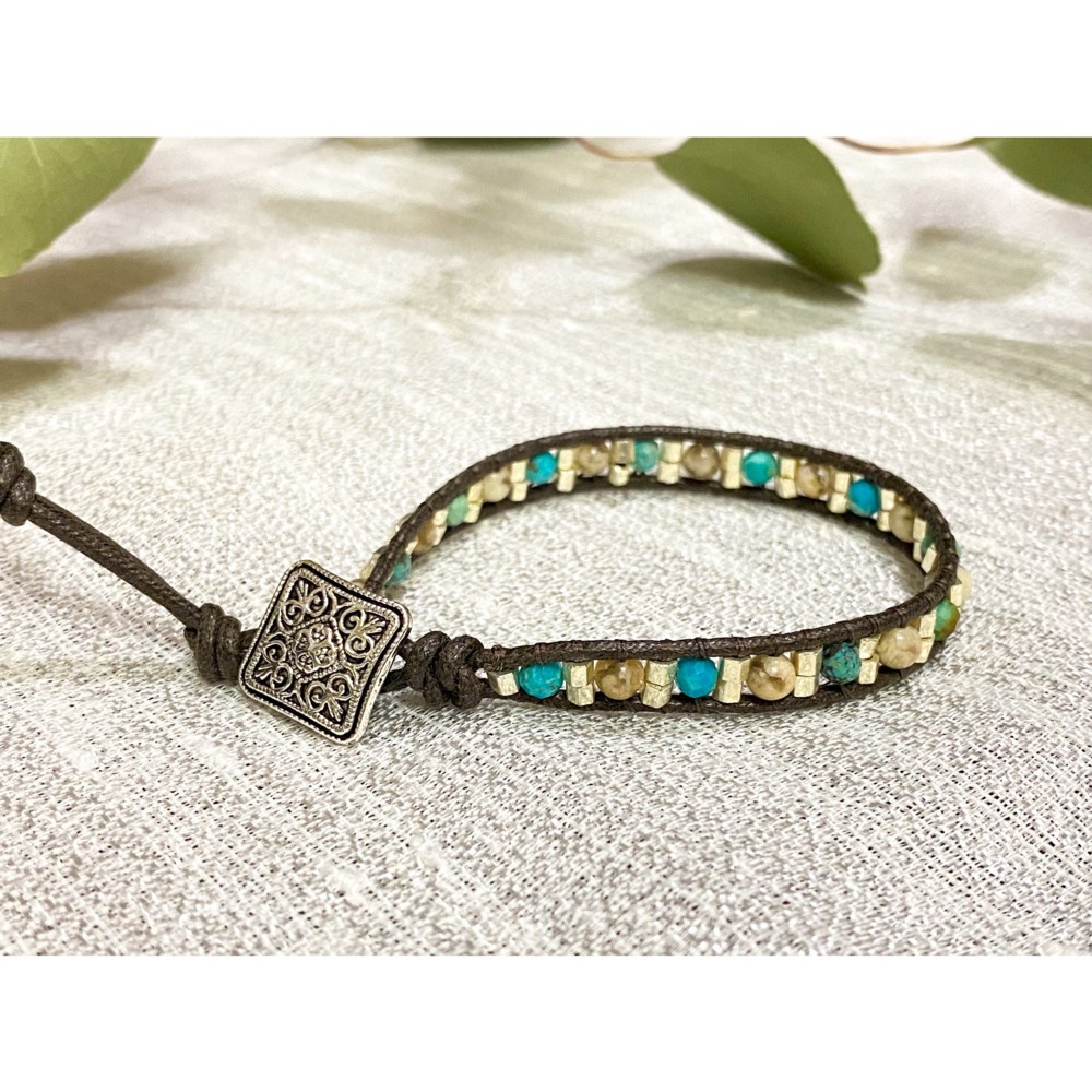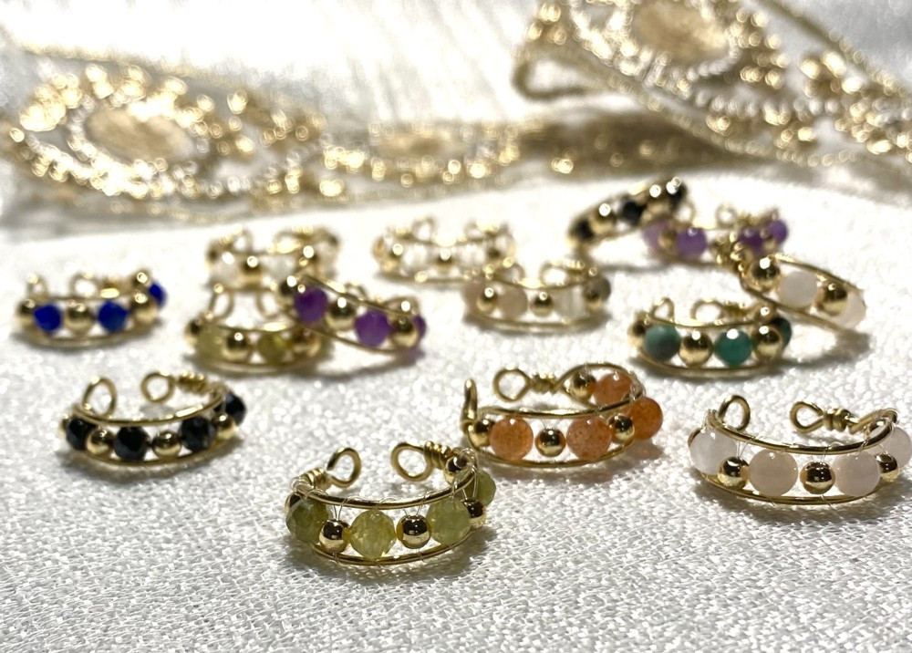 天然石やビーズを使ってエキゾチックなデザインのカフリングや耳飾り、ラップブレスレットなどのアクセサリーを制作しています。