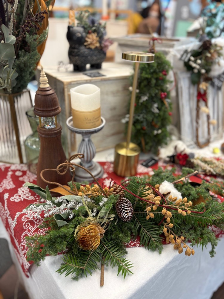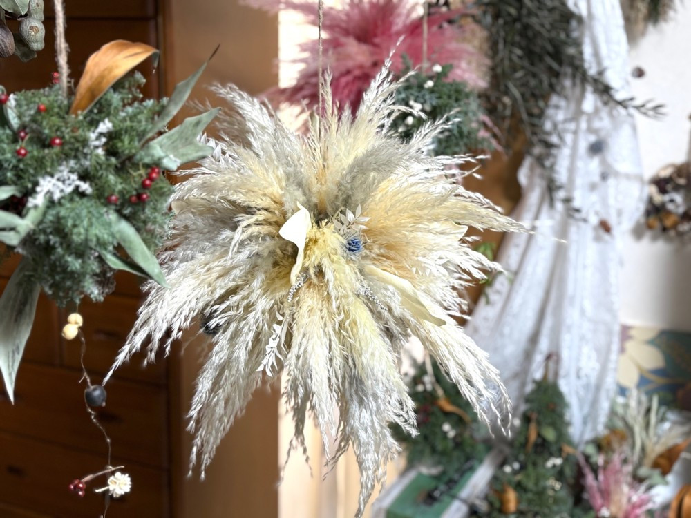 生花仕立てのクリスマス飾りやしめ縄飾りをお持ちします。針葉樹の香りに癒されてください。