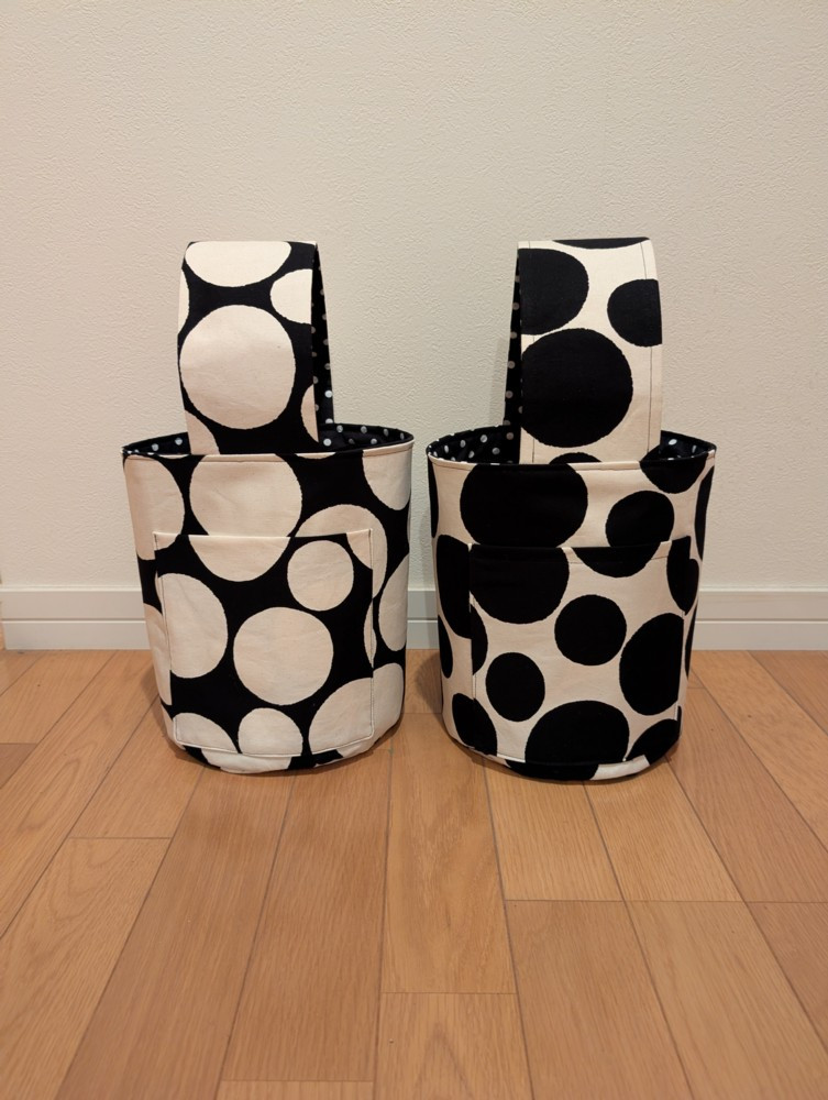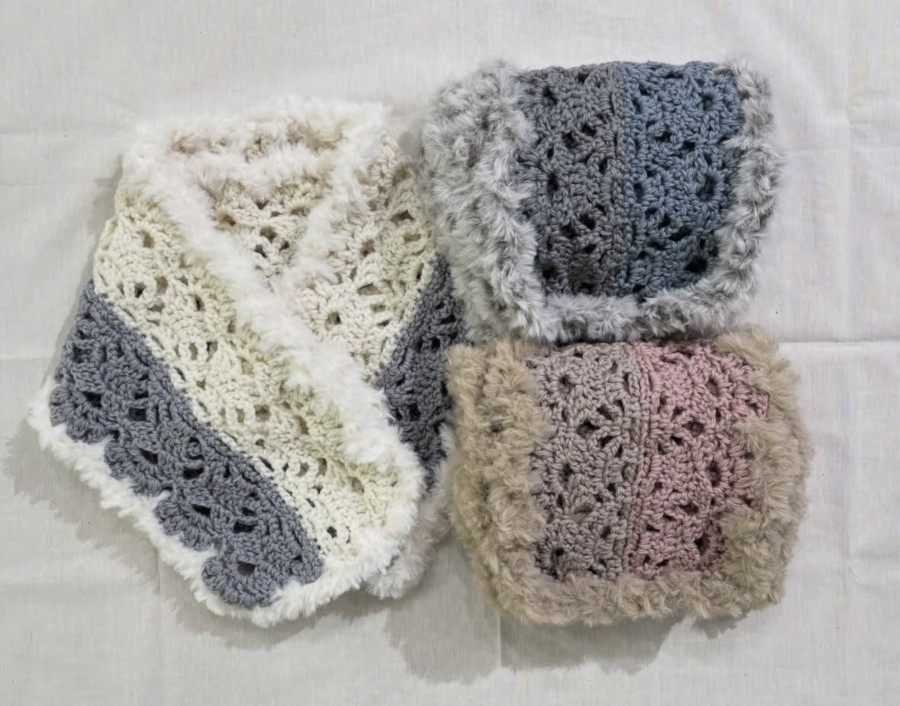マフラーやニット×布のバッグやポーチなどを使っています。