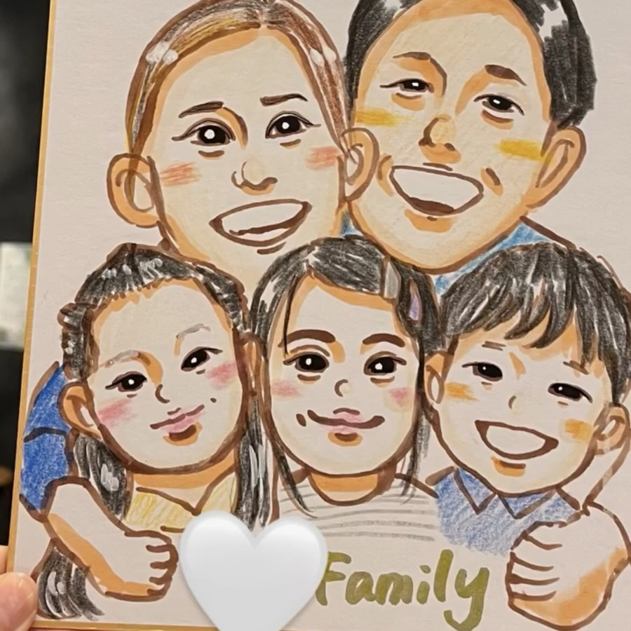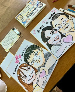 お写真を見て似顔絵を描きます。その場にいないご家族やペットなどもかけますのでプレゼントやサプライズにもピッタリ!