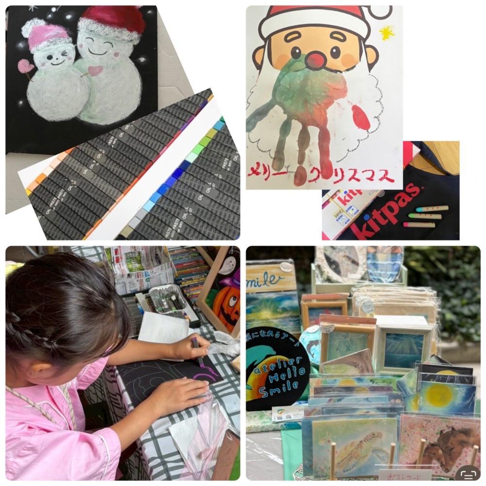 アートでワクワクそして癒される体験ワークです。ブラックボードに下絵のある絵にオイルパステルで色ぬりのようにぬり指でグラデーションをつけていき絵が出来上がるチョークアート 。